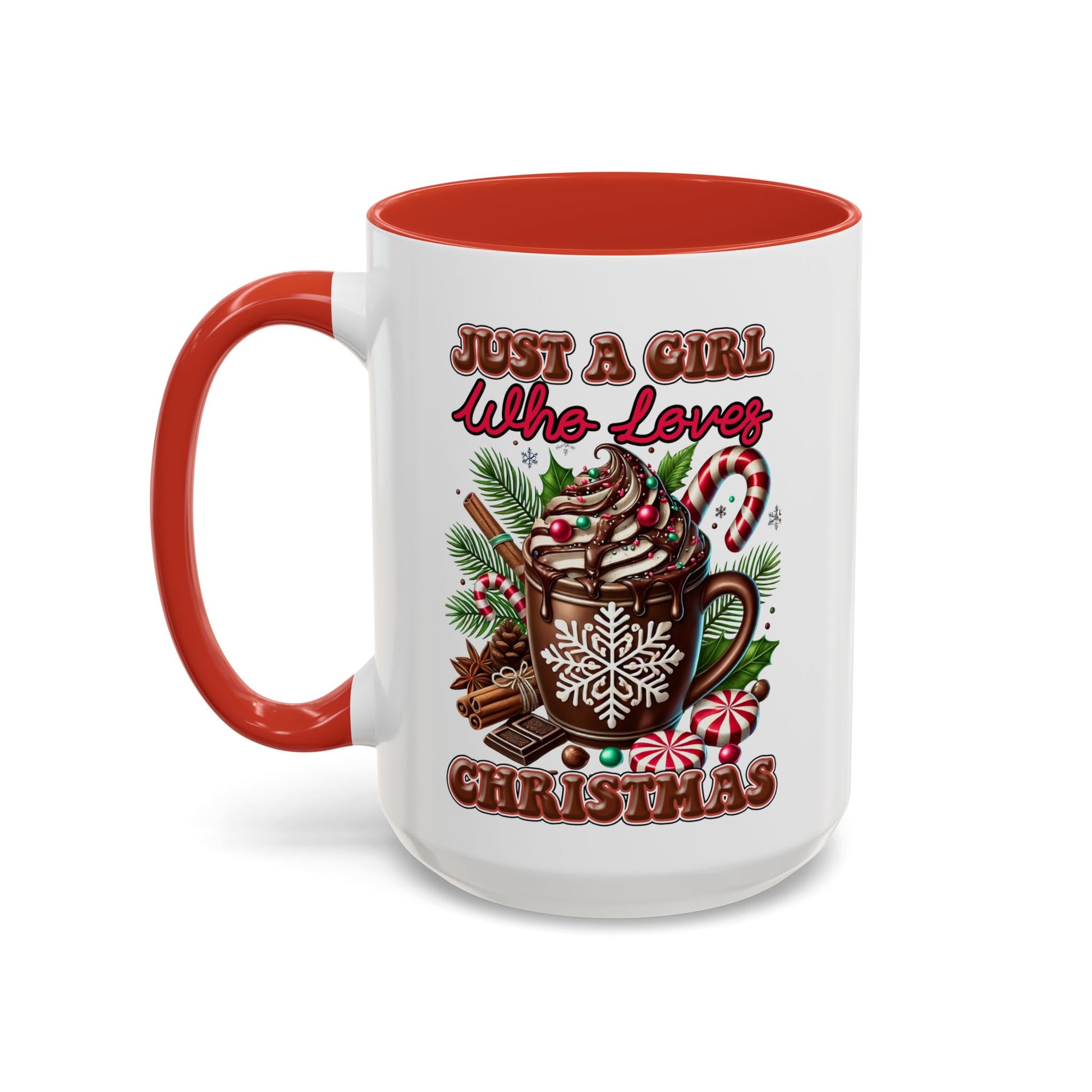 A festive holiday coffee mug with the words 'just a girl who loves Christmas'. Perfect for the Christmas enthusiast who loves to start their day with a cheerful cup of coffee. Ideal for holiday gift-giving and festive celebrations.