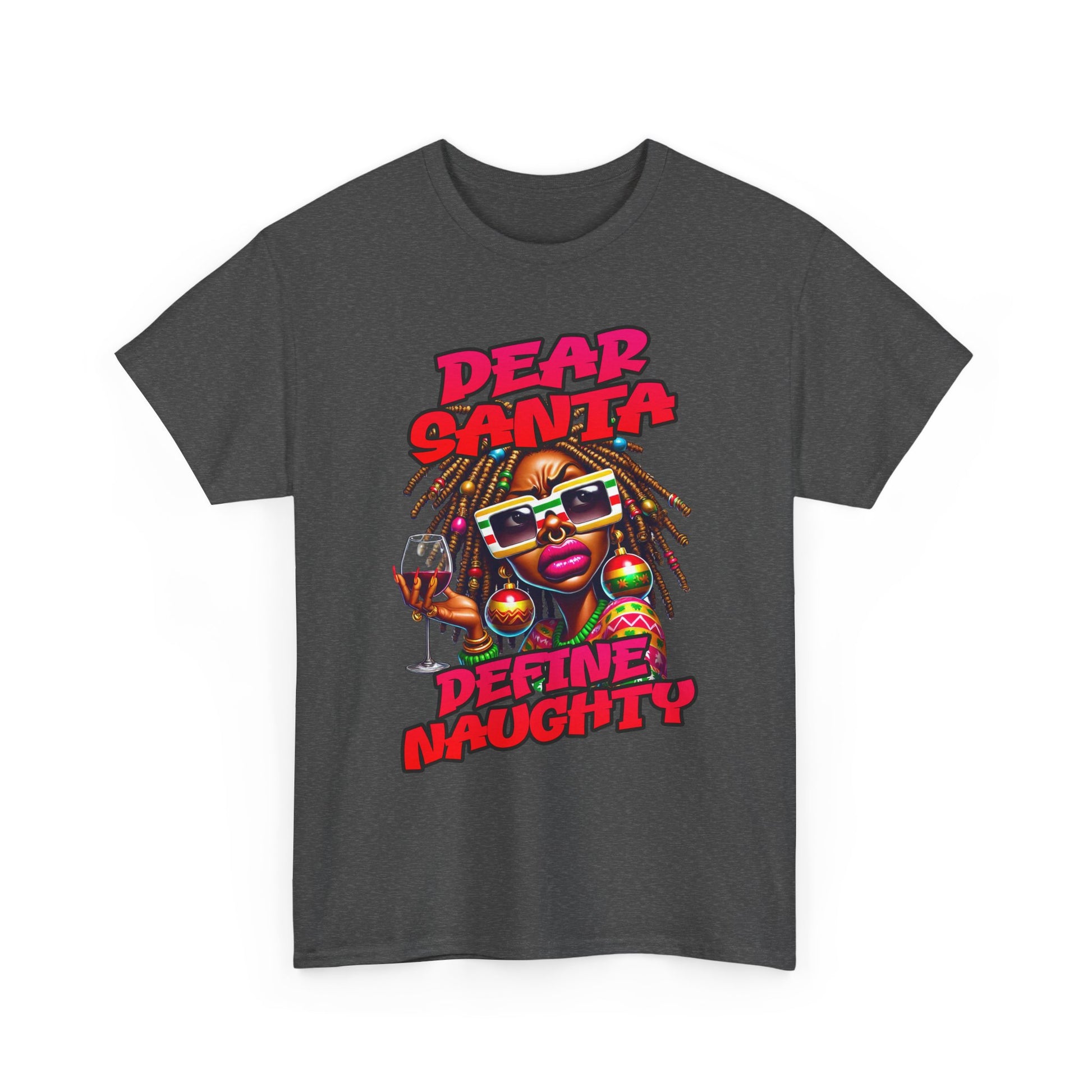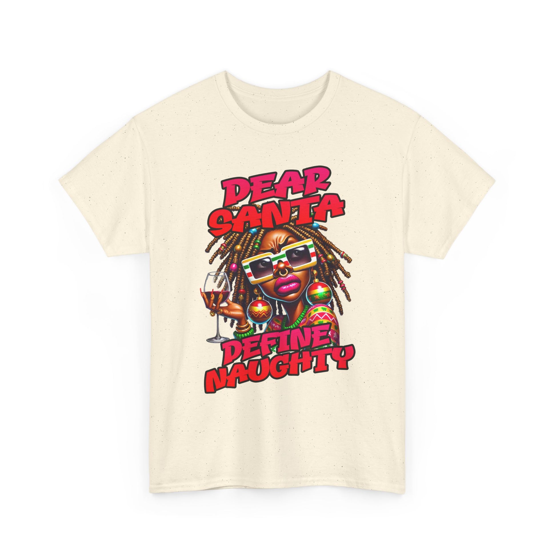 This bold graphic tee brings cheeky holiday attitude to everyday wear. A vibrant, cartoon-style character with festive ornaments and sunglasses pops against the clean white fabric, while the playful “Dear Santa — Define Naughty” headline adds humor and personality. The medium-weight cotton holds bright DTG/DTF prints well, so colors stay vivid wash after wash. Wear it to casual gatherings, holiday parties, or whenever you want to spark laughs and start conversations without trying too hard.